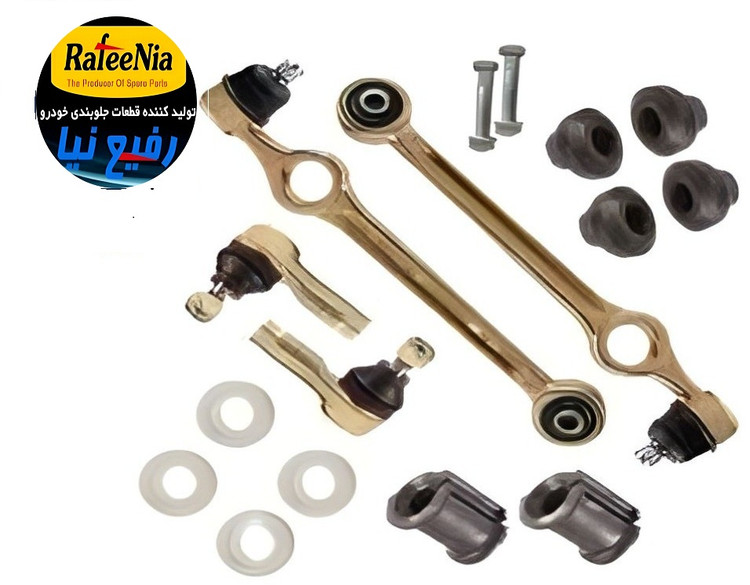 2عدد طبق بوش فلزی،2عدد سیبک(چپقی) فرمان، 4عدد لاستیک تعادل، 2 عدد لاستیک چاکدار(موجگیر) ،4 عدد محافظ بوش طبق و 2 عدد پیچ و مهره طبق
