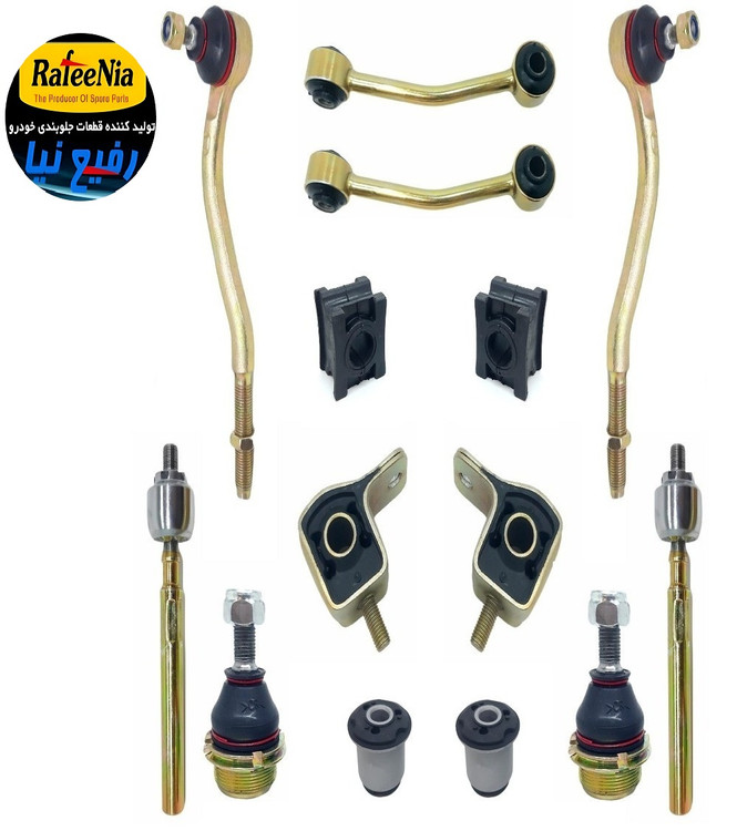 2 عدد بوش طبق جناقی ، 2 عدد بوش طبق لبه دار ، 2 عدد سیبک (چپقی) فرمان،2 عدد میل موجگیر(تعادل) پژویی ، 2 عدد سیبک زیر کمک(زیر اکسل) ،2 عدد لاستیک چاکدار و 2 عدد کوی فرمان
