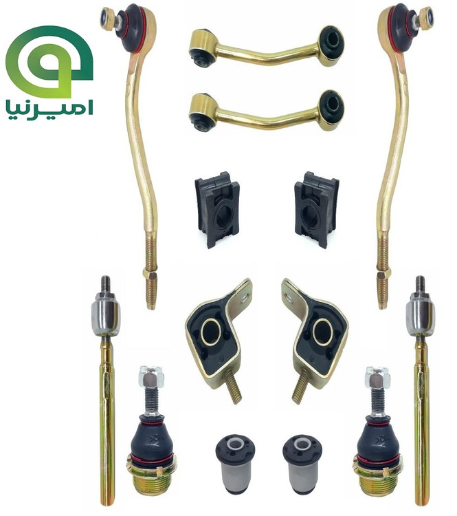 2عدد بوش طبق جناقی،2عدد بوش طبق لبه دار،2عدد سیبک(چپقی)فرمان،2عدد میل موجگیر(تعادل) پژویی،2عدد سیبک زیر کمک(زیراکسل)،2عدد لاستیک چاکدار،2عدد گوی فرمان